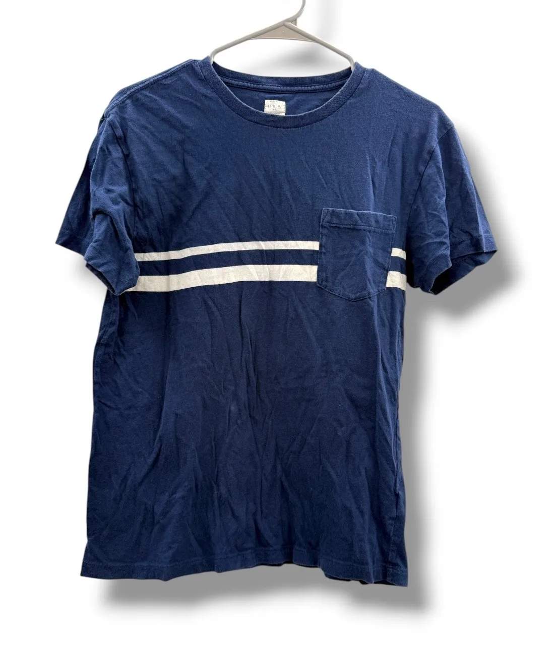 J.Crew Factory Slim Fit Shirt Women's Small Navy Striped Casual Pocket Tee Effortless, timeless, and perfectly casual — this J.Crew Factory Slim Fit Tee is the kind of everyday staple you'll reach for again and again. Made from soft cotton with a flattering slim silhouette, it features a classic navy base with double white chest stripes and a front pocket for a touch of laid-back style. Perfect for pairing with jeans, shorts, or under a blazer for an elevated casual look. Details: Brand: J.Crew Factory Style: Slim Fit Short Sleeve T-Shirt Color: Navy Blue with White Horizontal Stripes Fit: Slim, slightly fitted through the body Material: 100% Cotton Features: Crew neckline, chest pocket, double stripe detail, soft breathable feel Occasion: Everyday wear, weekend casual, layering basic Size: Women's Small Condition: Good, has some wash wear Approx. Measurements: Chest (pit to pit): 18 in Length (shoulder to hem): 25.5 in Keywords: J.Crew Factory shirt, navy striped tee, women's slim fit t-shirt, J.Crew Factory top small, J.Crew navy pocket tee, casual cotton shirt, minimalist tee, preppy navy shirt, classic stripe top, J.Crew basic