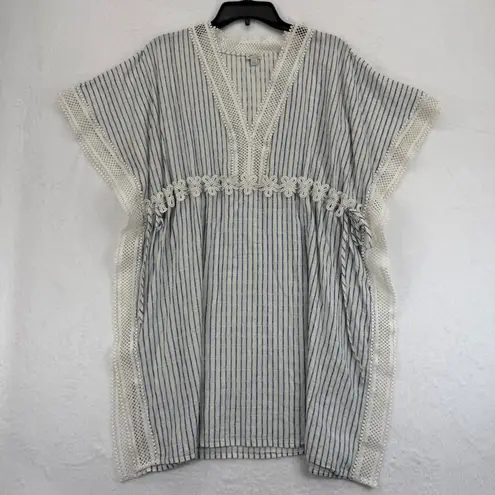 Keywords: J. Crew, Beachwear, Tunic, Cover-Up, Dress, Striped, Crochet, Blue, White, XS/S, Summer, Resort, Vacation, Boho, coastal, resort wear, swim coverup, striped mini dress, caftan, nautical