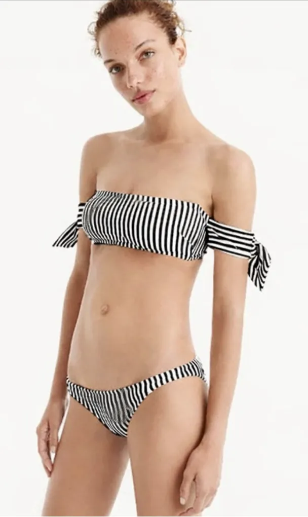 Darling seersucker bikini from J. Crew Bandeau top with arm loops Hipster bottoms Black and white st... Show more