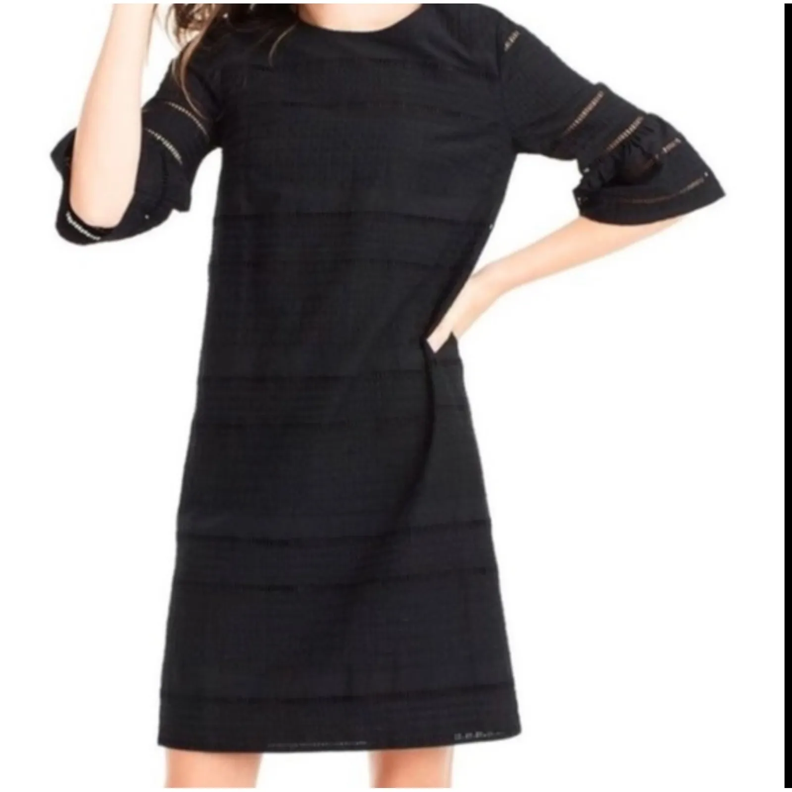 J. Crew black dress featuring intricate eyelet lace detailing throughout and elegant bell sleeves. T... Show more