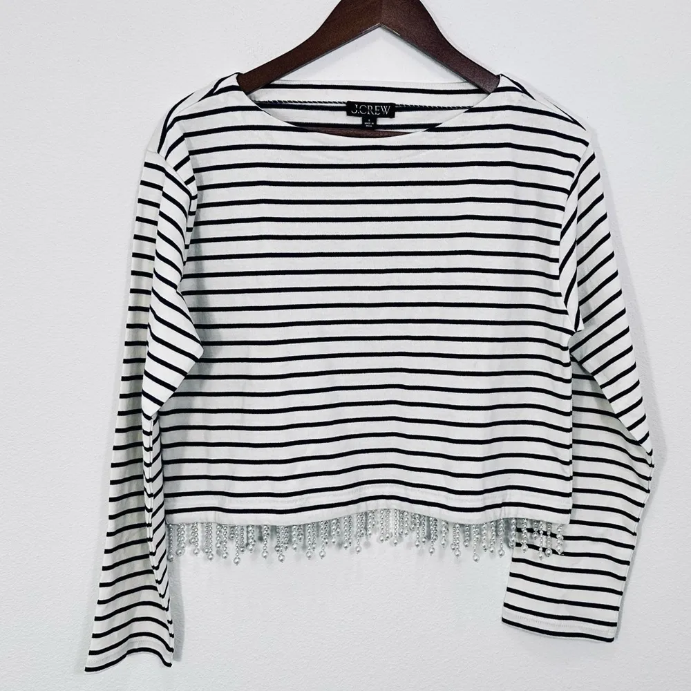 J. Crew Blouse Pearl Fringe Striped Long Sleeve Cropped Top Feminine Size S NWT Navy and White Strip... Show more