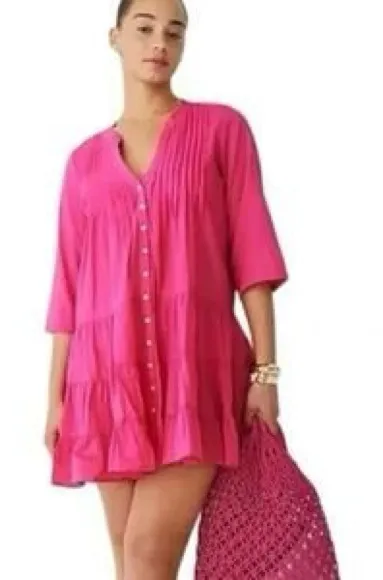 J. Crew Button Front Tiered Cover-up Dress Cotton Voile hot pink size Large. 3/4 sleeve. Light weigh... Show more