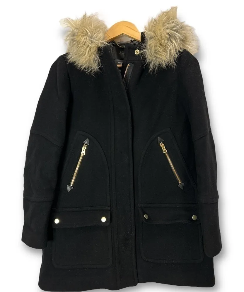 J Crew Coat Adult 4 Black Tan Stadium Cloth Nellie Gori Wool Blend Utility Women Large Hood Faux fur... Show more