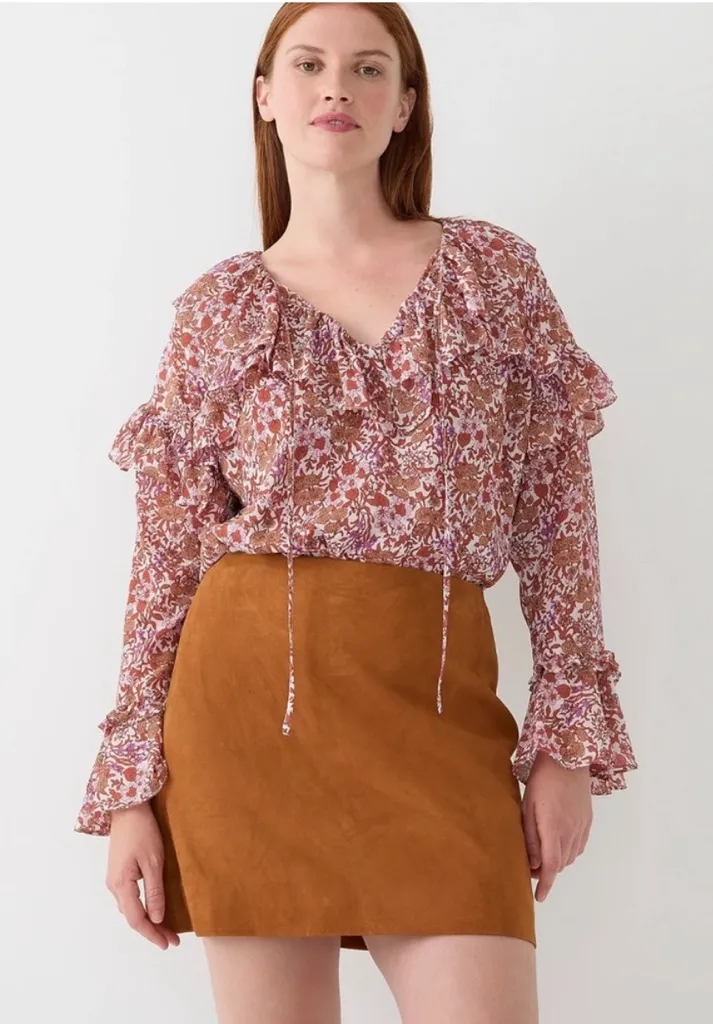 J. Crew Crinkle Chiffon Long Ruffle Sleeve Top Crafted from lightweight crinkle chiffon, this top drapes beautifully and offers a soft, airy feel that’s perfect for any season. The delicate texture adds dimension, while the ruffle detailing along the long sleeves brings a romantic and playful touch. Designed with a relaxed yet polished silhouette, this top is versatile enough for both casual and dressy occasions. Pair it with tailored trousers or a pencil skirt for a chic office look, or style it with jeans and heels for an elevated weekend outfit. The flowy fit flatters all body types, while the refined details make it an easy go-to piece for day-to-night dressing. Perfect for layering under a blazer or wearing solo with statement accessories, this J. Crew chiffon blouse is a timeless wardrobe essential. Whether you're heading to brunch, a special event, or just want to add a sophisticated touch to your everyday look, this top is the ultimate blend of style and versatility. Long bell sleeves Ruffle detailing Flower pattern V tie neckline Pullover styling Colors: pink/purple, orange, and white 100% polyester Style number: BL048 Size: M Measurements are provided in pictures Condition: Excellent tags: romantic style, date night, elegant evening, semi-formal event, workwear chic, office to dinner, wedding guest outfit, brunch with friends, holiday gathering, cocktail party, stylish layering, feminine and flirty, business casual, dinner party, garden party, classy
