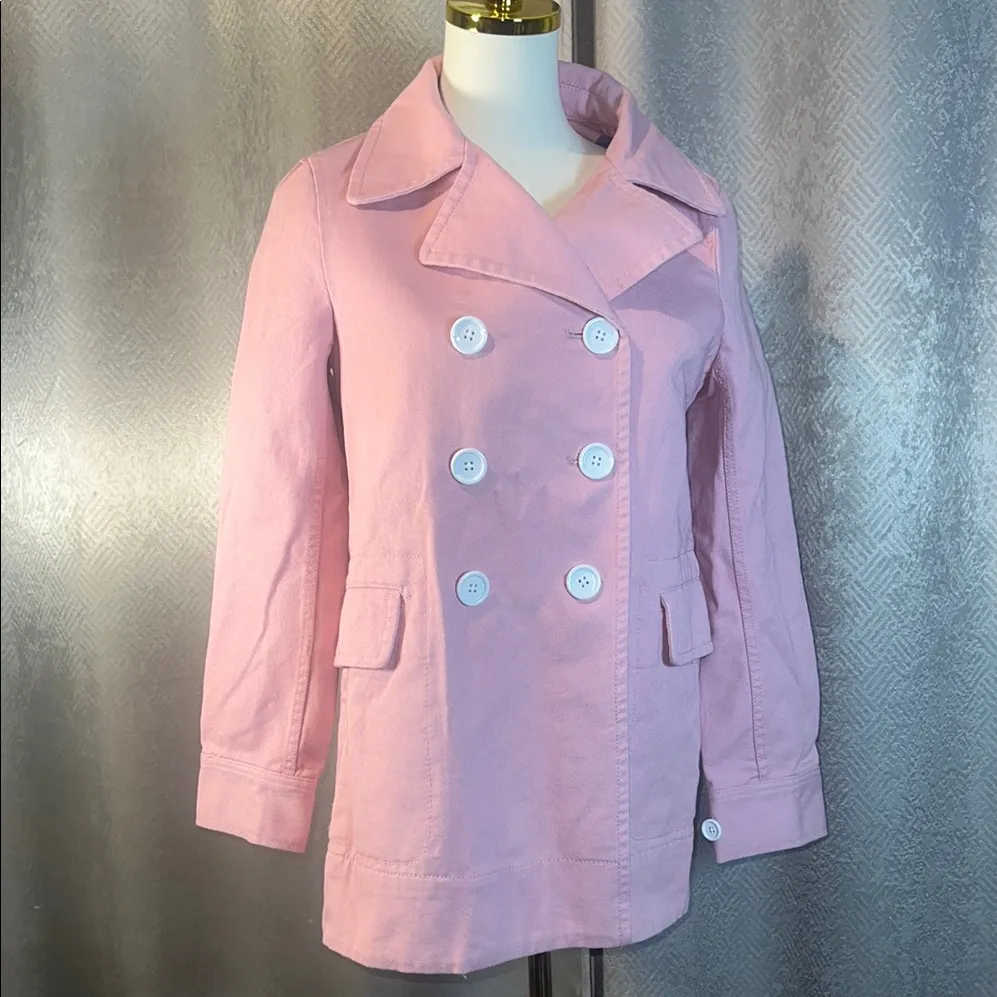 Chic pink pea coat with double-breasted design. Features classic lapels and front pockets. Ideal for... Show more