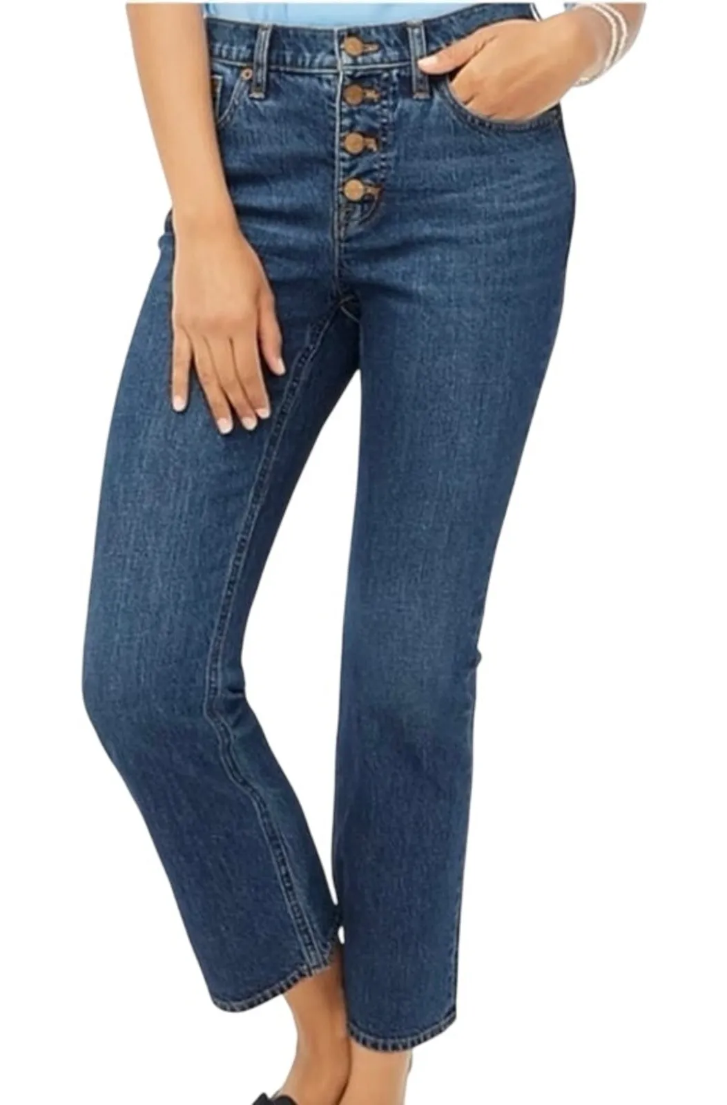 Excellent condition Darker Wash 10" mid rise Inseam approx. 24.5" Lightly flared cropped leg Exposed... Show more