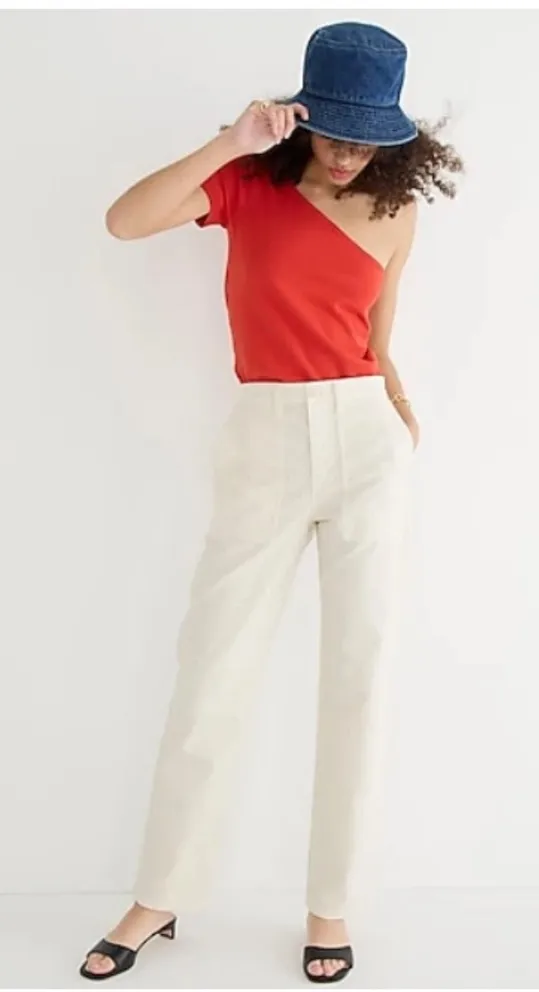 Zip fly with button closure. Front pockets. Back button flap pockets. High rise. Easy fit through hi... Show more