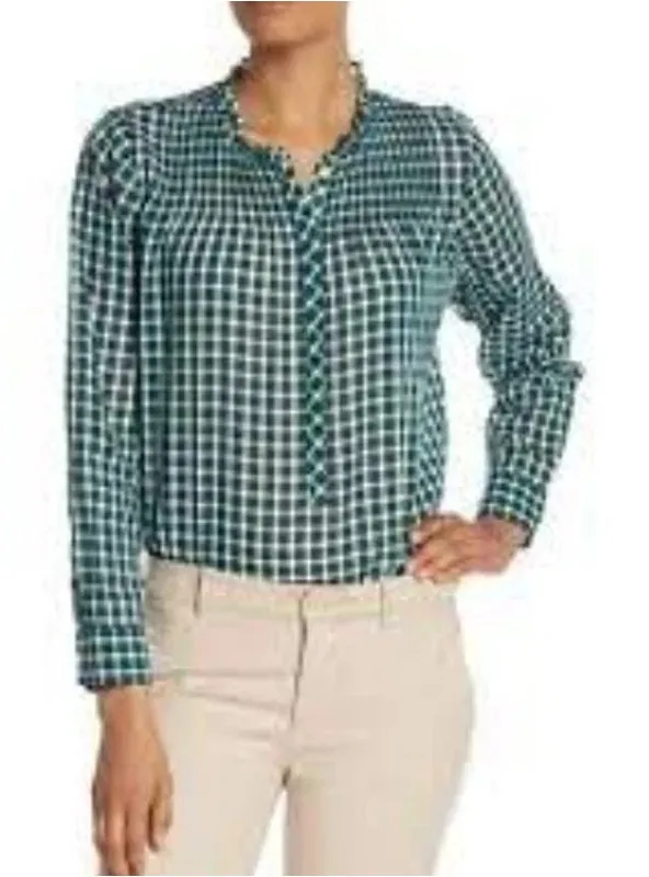 J. Crew Gingham Pleated Bib Ruffle Trim Long Sleeve Blouse Green Size 4 Retails for $88 Excellent Co... Show more