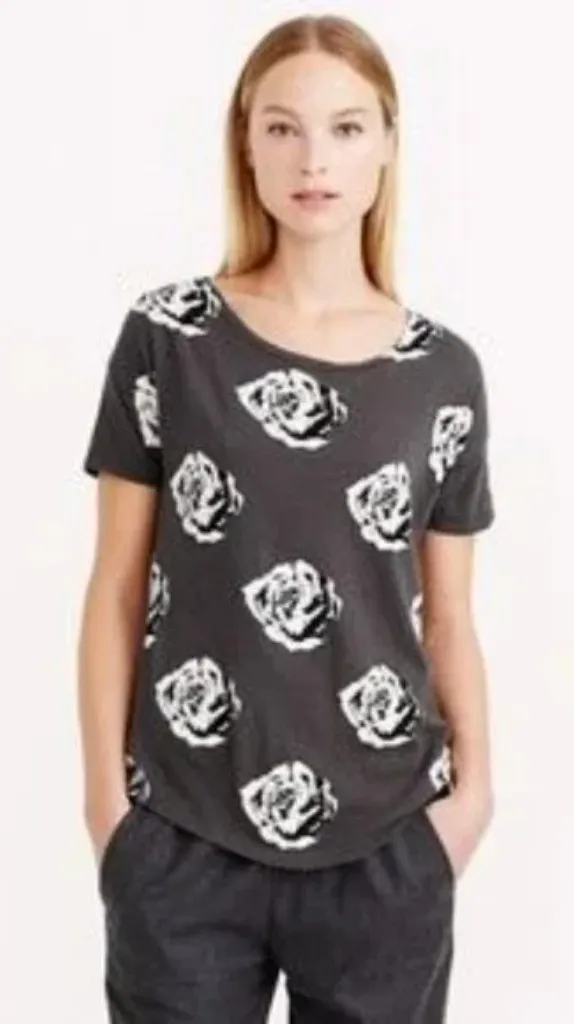 - Fun tee blooms with cream pop roses screen printed on a charcoal gray background. Excellent pre-ow... Show more