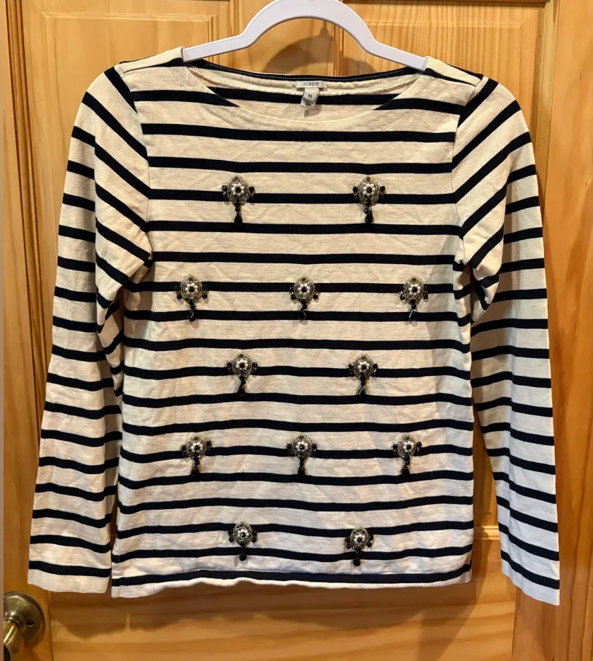 This J. Crew Jeweled Embellished Striped Long Sleeve Top Cream Beige top with very deep navy accents... Show more