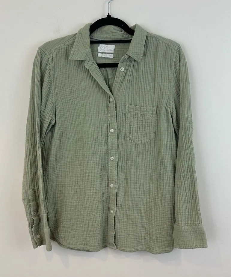 Excellent used condition light green button down. Gauzy, soft material. Light green shirt with a te... Show more