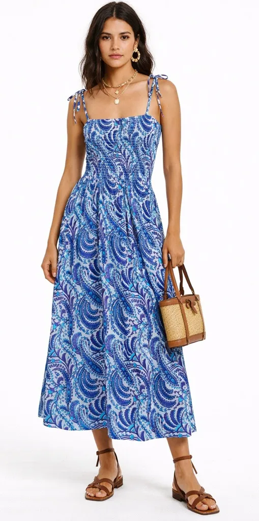 J. Crew linen blend midi dress. Elastic ruched bodice. Detachable tie straps to wear bandeau style.... Show more