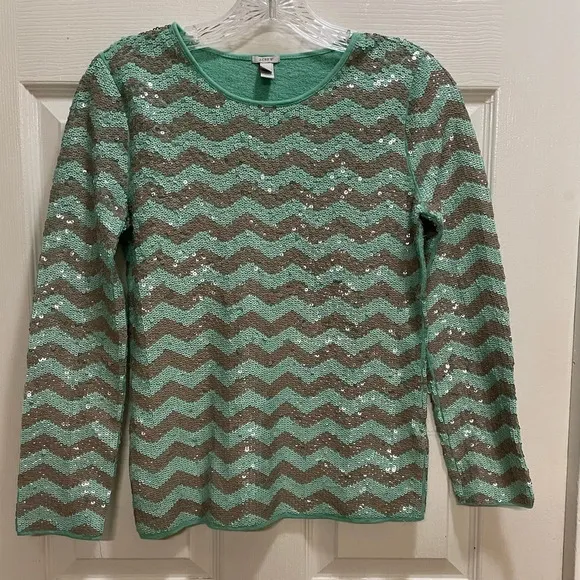 This is a listing for a preowned J. Crew Mint Green Chevron Sequin Long Sleeve Size XS. There are a... Show more