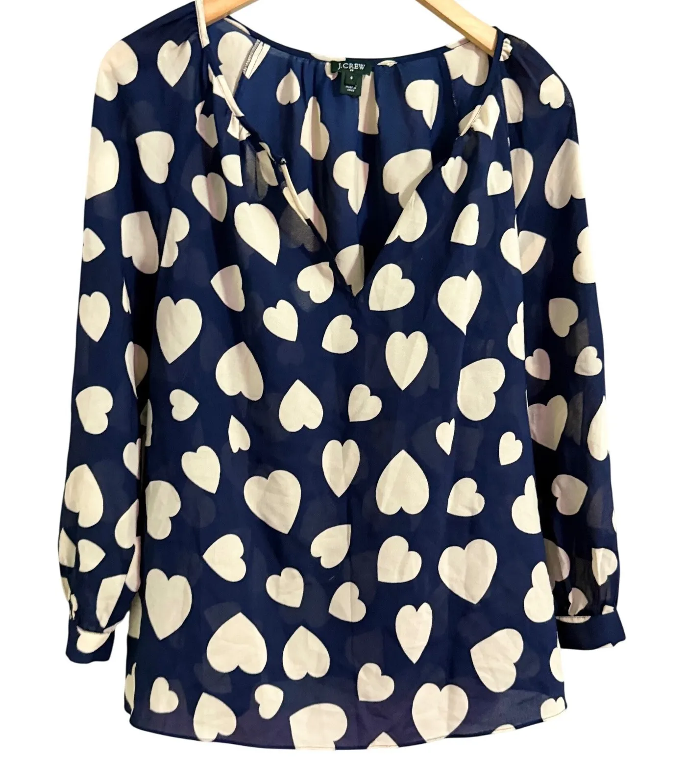 Adorn yourself in playful charm with this delightful J. Crew blouse, a whisper-light piece that promises to bring joy to your wardrobe. The sheer navy chiffon fabric drapes beautifully, creating an ethereal silhouette that flatters every figure. Scattered across the expanse are sweet, cream-colored hearts, a motif that exudes pure affection and whimsical flair. Its flowing design and elegant V-neckline offer a touch of sophisticated allure, while the long sleeves provide a graceful finish. This blouse is perfect for a romantic Valentine's Day dinner, a fun brunch with friends, or simply adding a touch of personality to your everyday style.