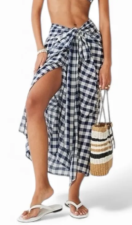 J. Crew Navy Blue Tie-Front Sarang White Plaid Skirt Halter Dress Size L New with tag! Style BQ956... Show more