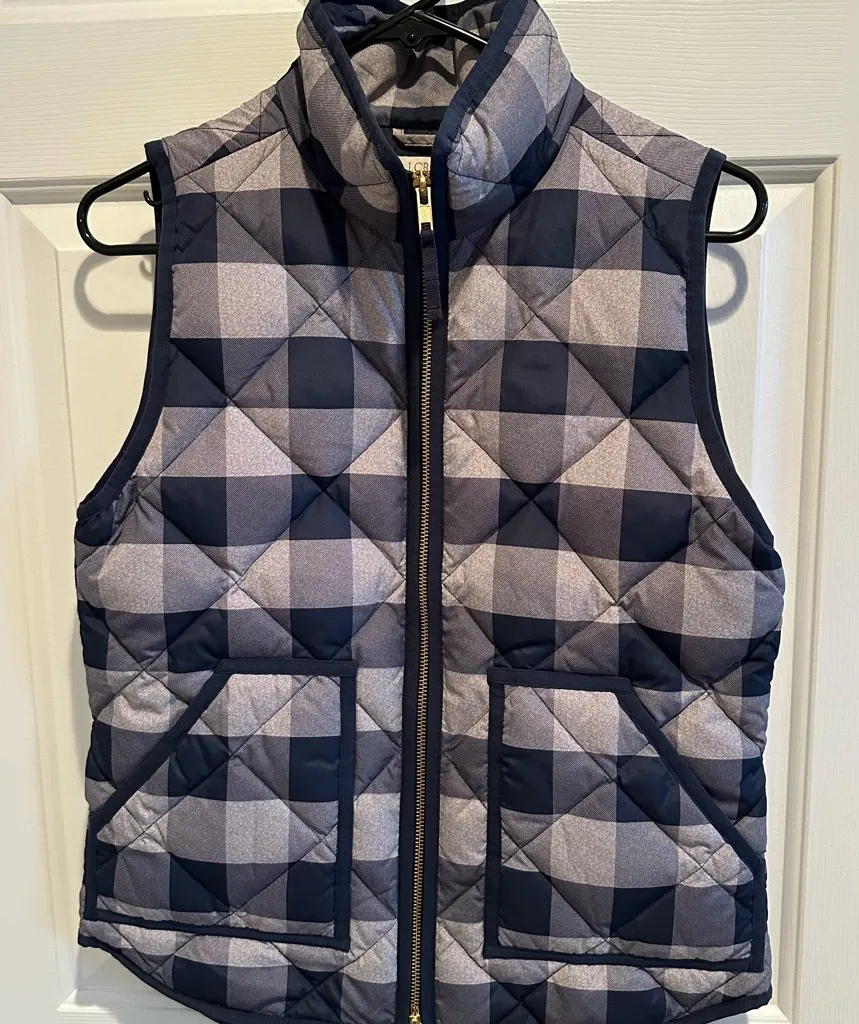 The J Crew Vest is a stylish women's XS navy blue quilted puffer vest made with durable linen outer... Show more