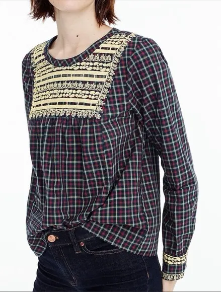 J. Crew NWT Embroidered Gilded Plaid Peasant Holiday Top Women’s Size XS Red/Green/ Multi - Gold Em... Show more