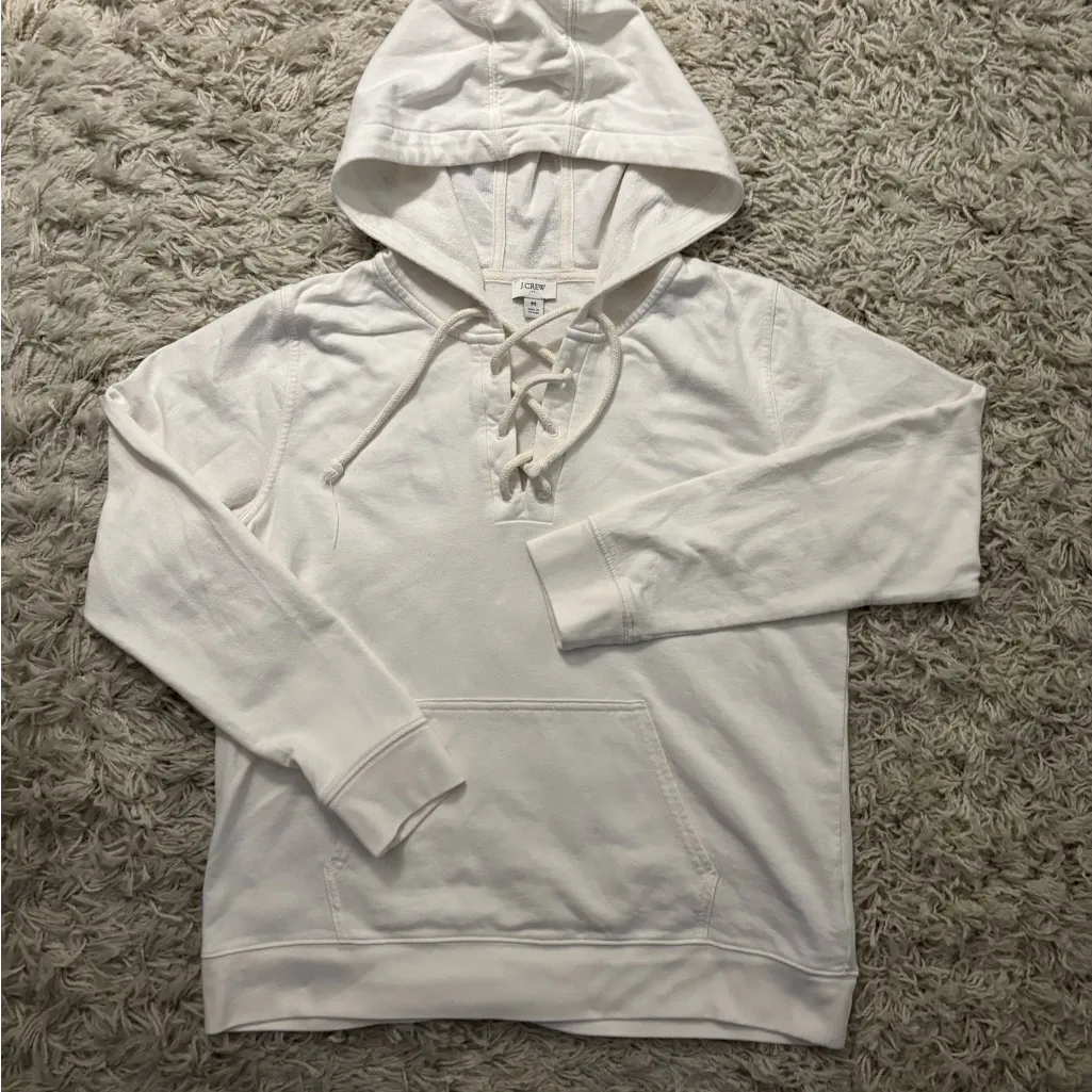 Stylish off-white long sleeve hoodie with lace-up front. Ideal for casual wear. Kangaroo pocket 25”... Show more