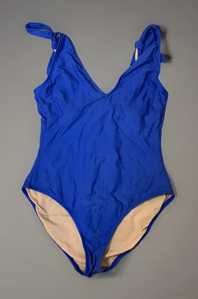 Keywords: J. Crew, one piece swimsuit, bathing suit, cobalt blue, tie shoulder, v-neck, swimwear, beachwear, poolside, vacation, summer, lined swimsuit, classic swimsuit