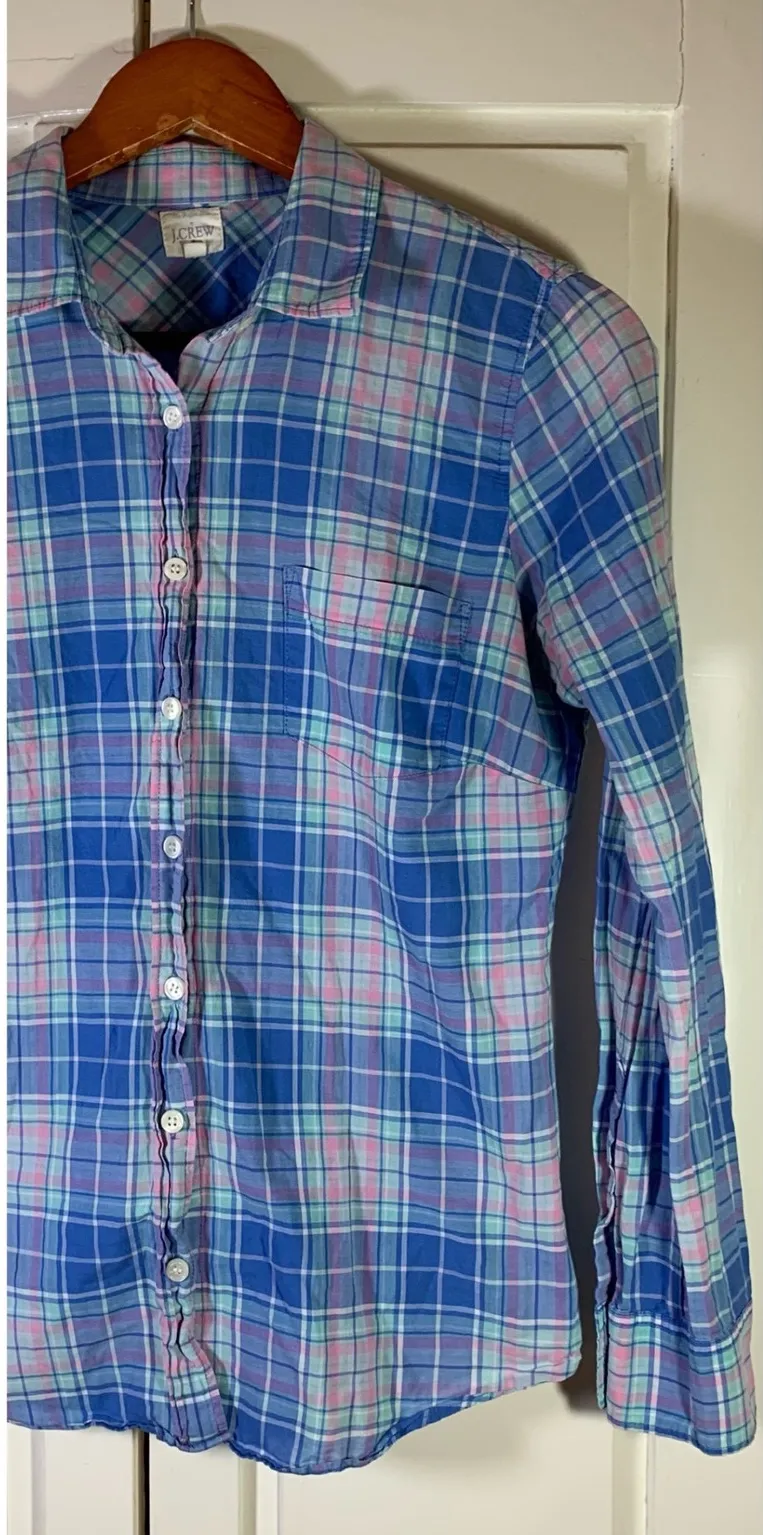 J. Crew button-down collared shirt in a classic plaid pattern. Features a front button closure and a... Show more
