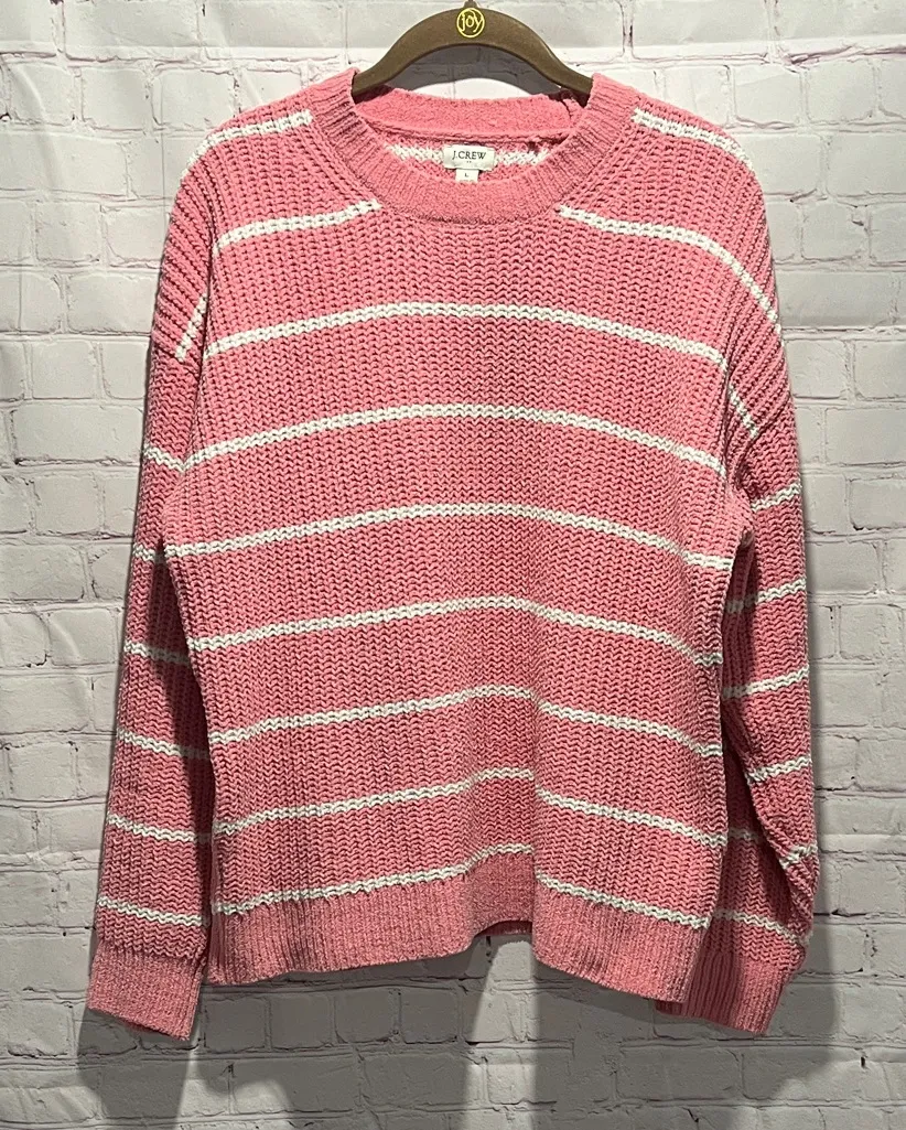 Stylish crew neck sweater with pink and white stripes. Perfect for everyday wear.