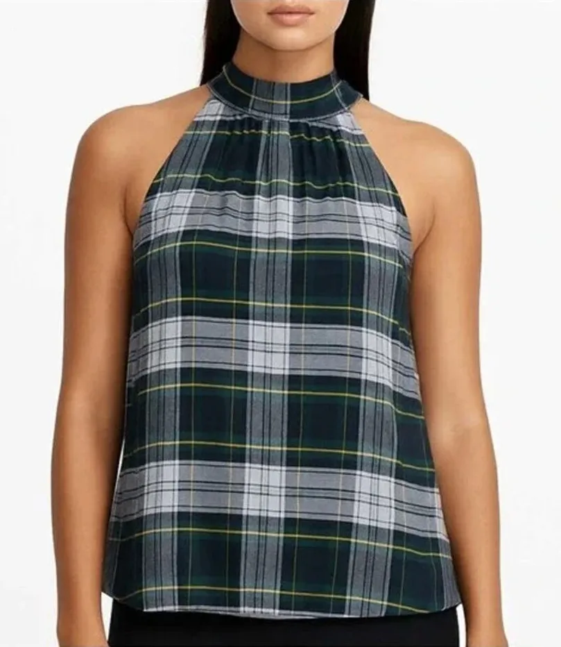 Bold windowpane plaid pattern in navy blue, green, white, and yellow High neck halter style with s... Show more