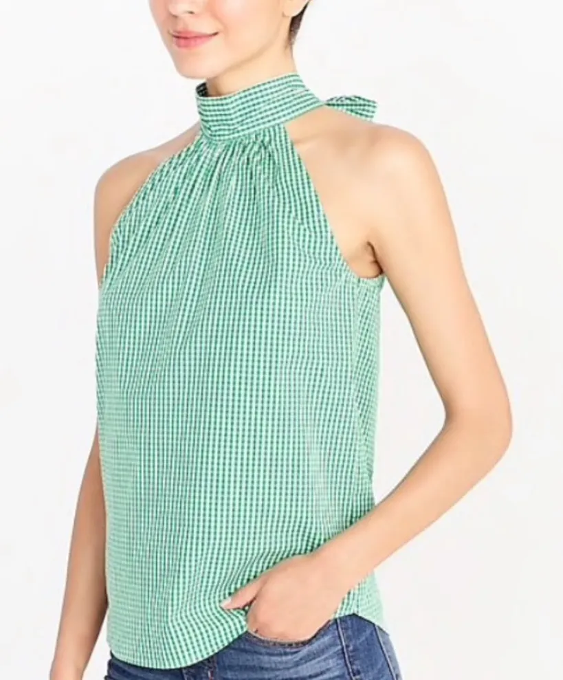 Elevate your style with this chic green checkered tie-neck tank top. Perfect for casual outings or a... Show more