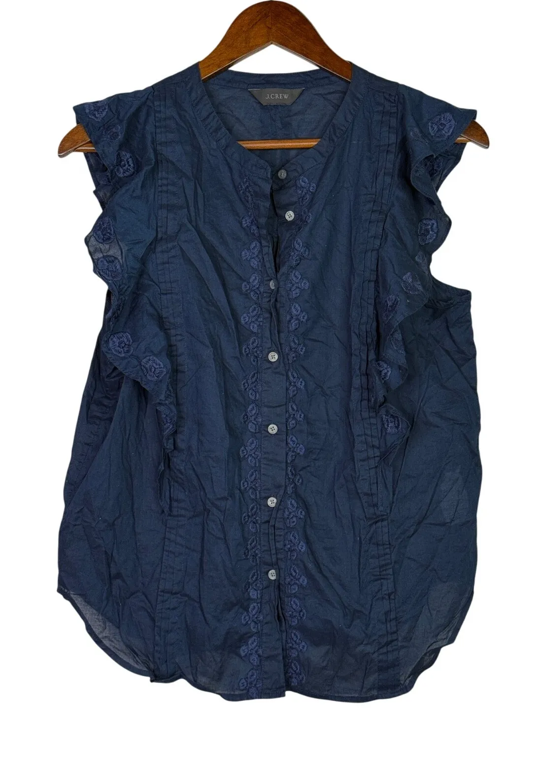 J. Crew Ruffled Neck Floral Embroidered Detail Sleeveless Blouse Button Up Top Large Navy Blue Ador... Show more