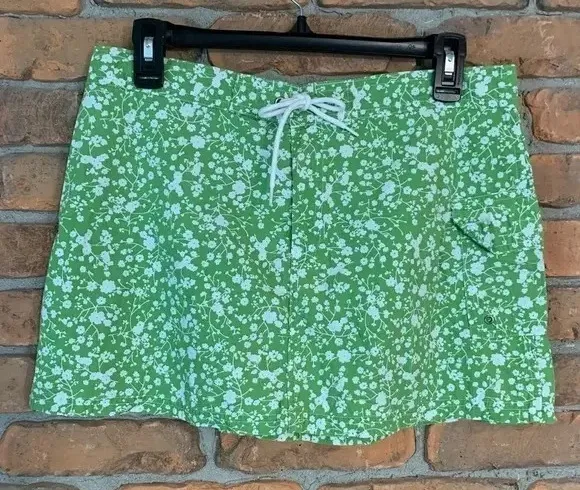 A charming skirt featuring a vibrant green background adorned with a delicate white floral print. It... Show more