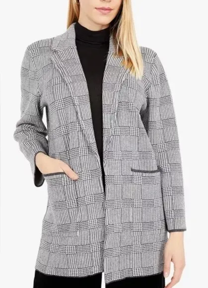 Elevate your style with this chic gray plaid jacket. Perfect for any occasion, it offers a sophistic... Show more