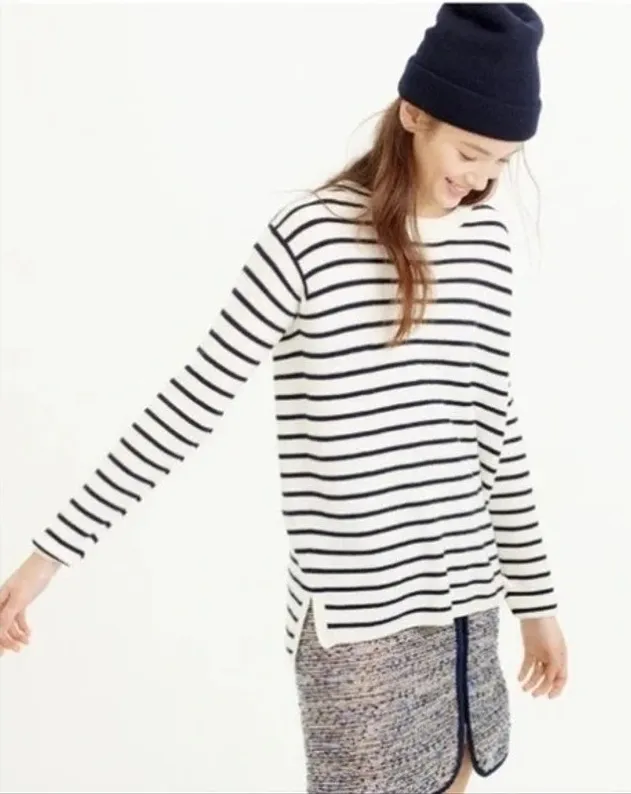 J. Crew Striped Leather Panel Wool Lightweight Knit Long Sleeve Sweater XS Black Cream White Excell... Show more