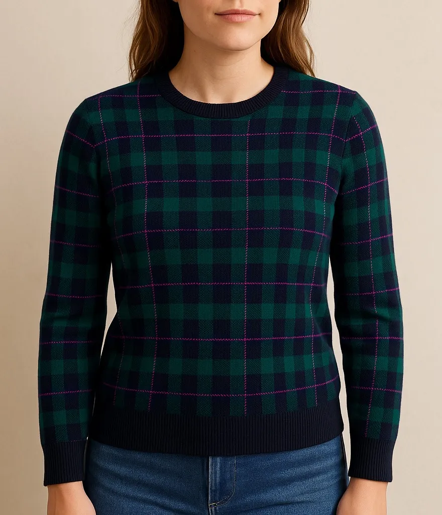 J. Crew Factory Tartan Teddie sweater in Academic Green Plum. Classic plaid crewneck, 100% cotton, h... Show more