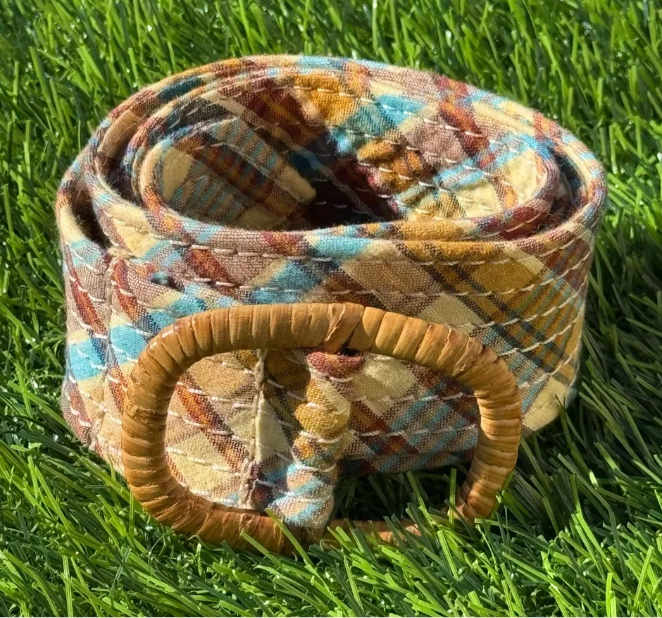 Vibrant plaid belt with a woven buckle. Features a mix of blue, yellow, and red tones. Size Small/M... Show more