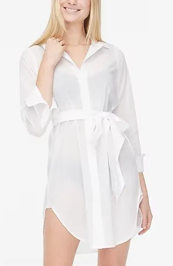 A J. Crew white sheer button-down shirt dress with a tie waist. This lightweight dress features a cl... Show more