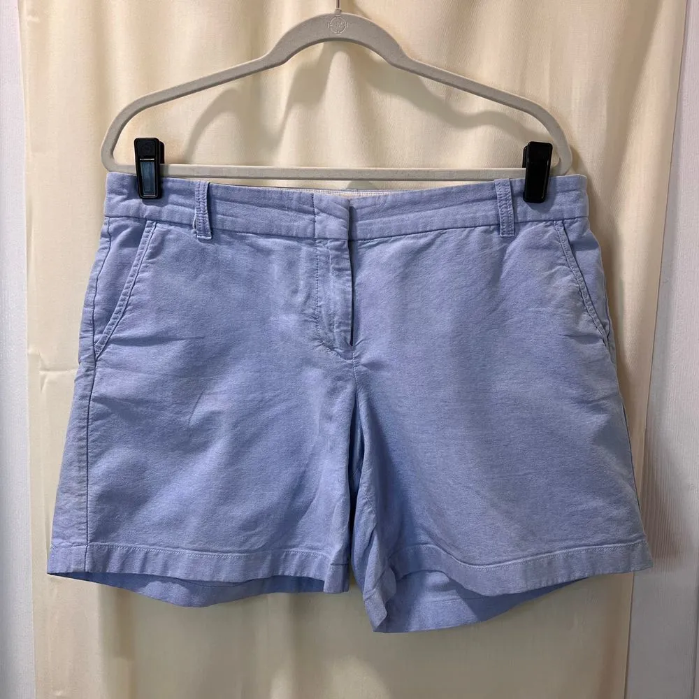 Perfect for warm weather, these light blue chino shorts are a summer wardrobe essential. Features a clean-cut design with front slant pockets and back welt pockets. The mid-length cut offers versatile styling options - pair with a crisp white blouse for lunch dates or a casual tee for weekend errands. The lightweight fabric ensures all-day comfort while maintaining a polished look. Flat Waist 18" Inseam 6" Performance/Activity: Walking, Beach, Golf, School, Cross Training Style: Chino Color: Blue Department: Women Material: Cotton Blend, Polyester Blend Fit: Classic Fabric Type: Twill Occasion: Casual, Travel, Workwear Pattern: Solid Accents: Button, Zipper Front Type: Flat Front Keywords: chino shorts, summer shorts, light blue shorts, casual shorts, walking shorts, womens shorts, cotton shorts, mid length shorts, preppy shorts, classic shorts