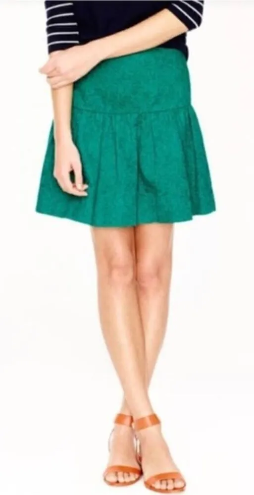 J.Crew Matelasse Drop-Waist Mini Skirt in Green 100% Cotton, Size 4 Features: zipper back closure, fully lined, drop waist with flare silhouette, 100% cotton textured fabric, mini hem. Color: green. Approx. Flat Measurements: Waist: 15" Length: 17" • Excellent preowned condition • Smoke & pet-free environment • Next-day shipping • Accepting Offers #G5F8b0625