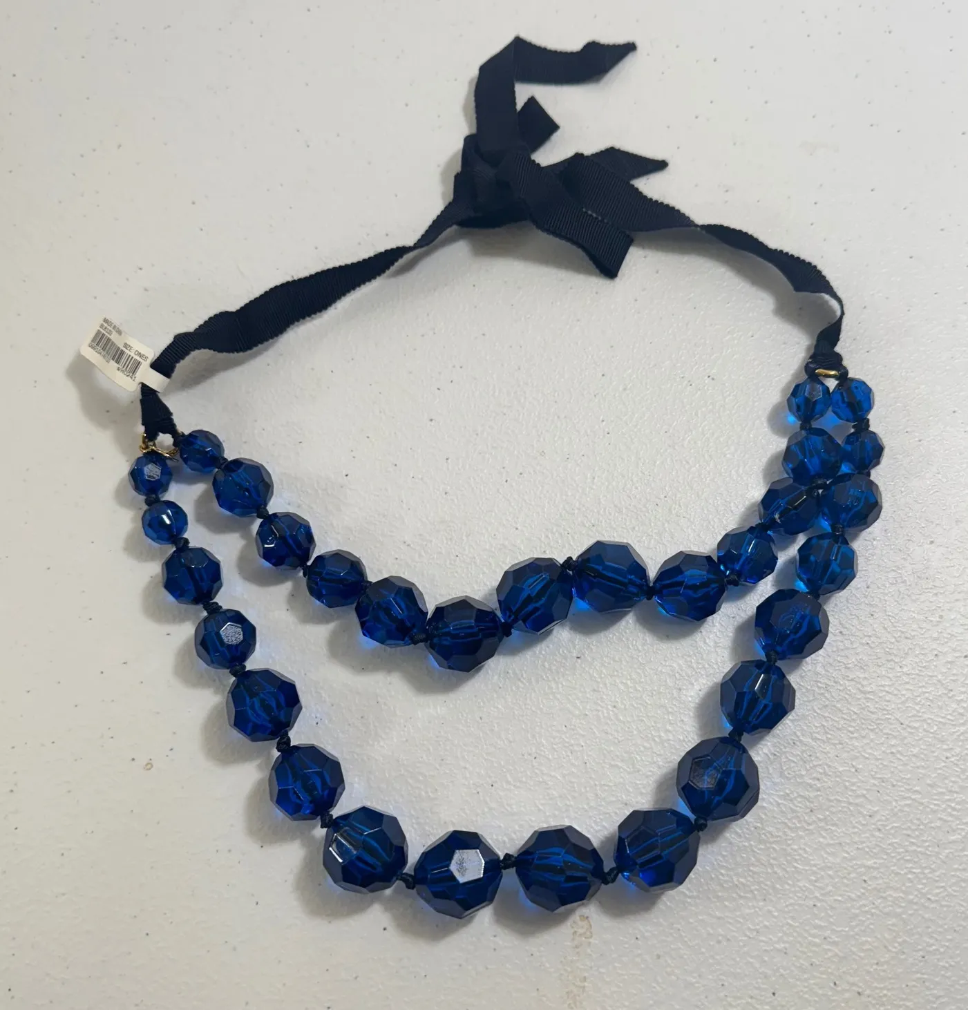 Keywords: J. Crew, beaded necklace, faceted beads, navy blue, glass beads, ribbon tie, two strand, statement necklace, chunky beads, elegant, sophisticated, pop of color, day to night