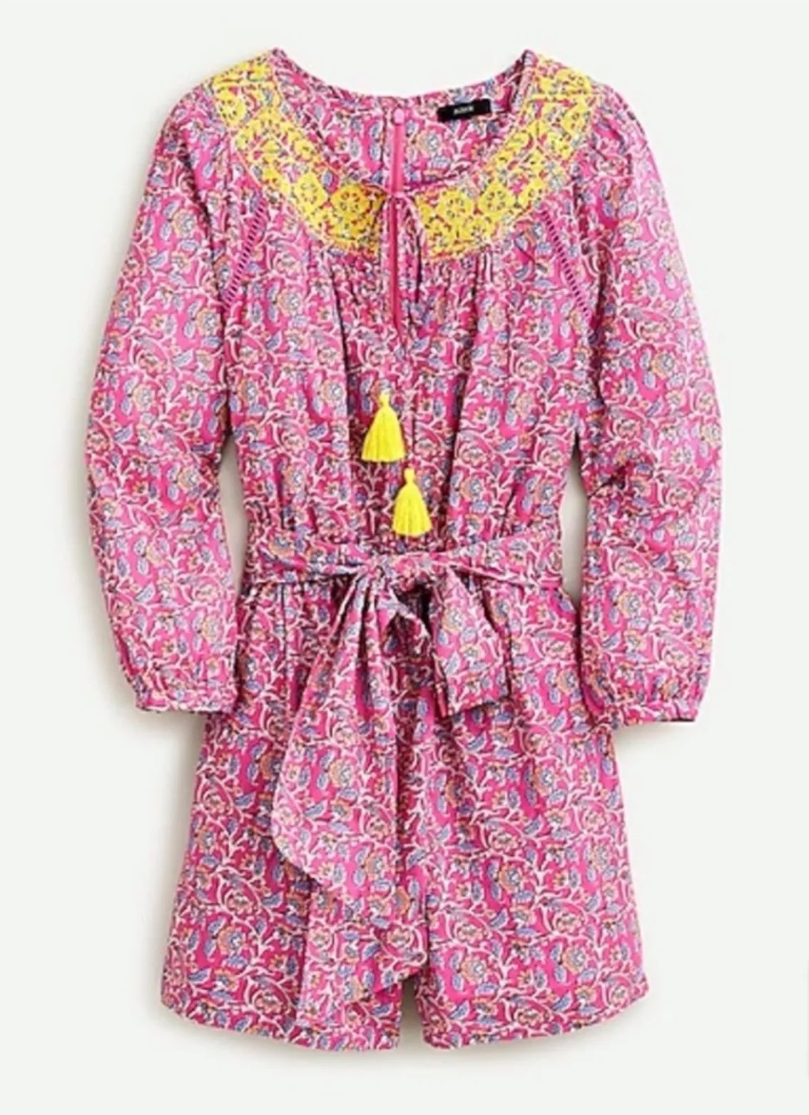 J. Crew Pink Yellow Embroidered Romper Size 8 Style AP193 Self tie Belt in same fabric Pockets Zi... Show more
