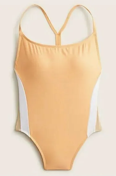 Keywords: J. Crew, one-piece, swimsuit, orange, women's swimwear, colorblock, recycled materials, beachwear, poolside, sustainable fashion, lightweight, comfortable fit, contrast panel, active, machine washable, paddling, surfing.