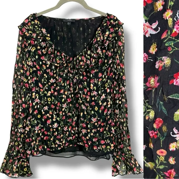 J. Crew Ruffle-neck Top in Midnight Vintage Floral Size Large Metallic Gold Black MSRP $118 Ar... Show more