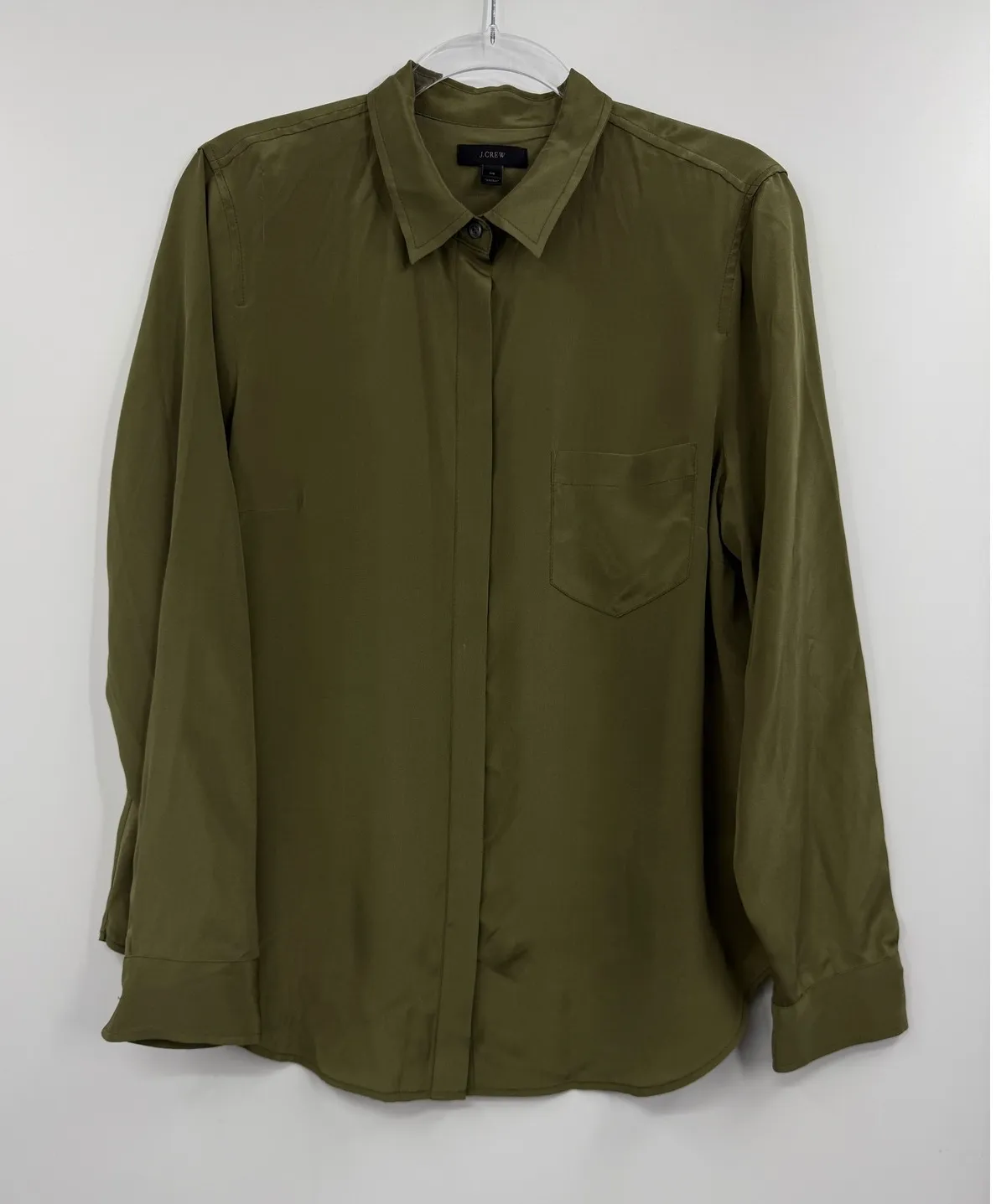 J.Crew olive green silk long sleeve button down shirt. This classic fit shirt features a single ches... Show more