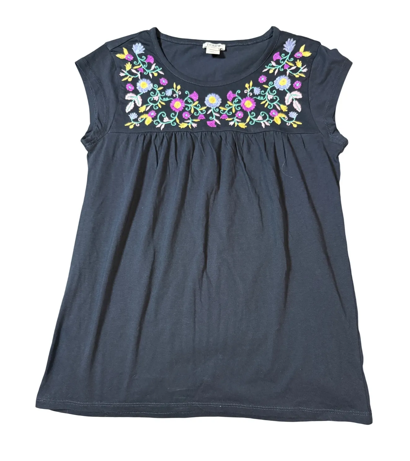 J.Crew Size XXS Short Sleeve Navy Blue Crew Neck Shirt Tee Embroidered Floral Purple Green Pink Yell... Show more