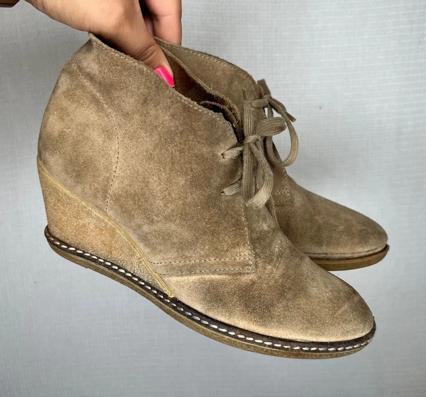 Stylish wedge booties in a versatile tan color, perfect for adding a touch of effortless chic to any outfit. The rounded toe and the minimalist design, combined with the stitching detail on the sole, make them a versatile addition to your footwear collection. These booties offer a blend of fashion and function suitable for daily wear. Style: Bootie Color: Beige Upper Material: Suede Shoe Shaft Style: Ankle Heel Style: Wedge Occasion: Casual Toe Shape: Round Toe Type: Boot Model: Suede Wedge Desert Boot Keywords: suede booties, wedge ankle boots, lace up boots, desert boots, casual shoes, womens boots, ankle booties, tan booties, wedge heel, suede ankle boots, comfortable boots, fashion boots