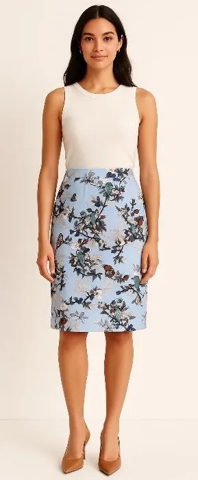 Beautiful J.Crew The Pencil Skirt in a stunning soft blue bird & botanical floral print. Features a... Show more