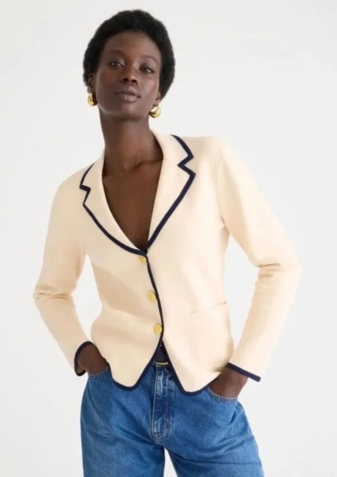 Discover the elegance of this J. Crew blazer, crafted in a sophisticated cream with contrasting navy... Show more