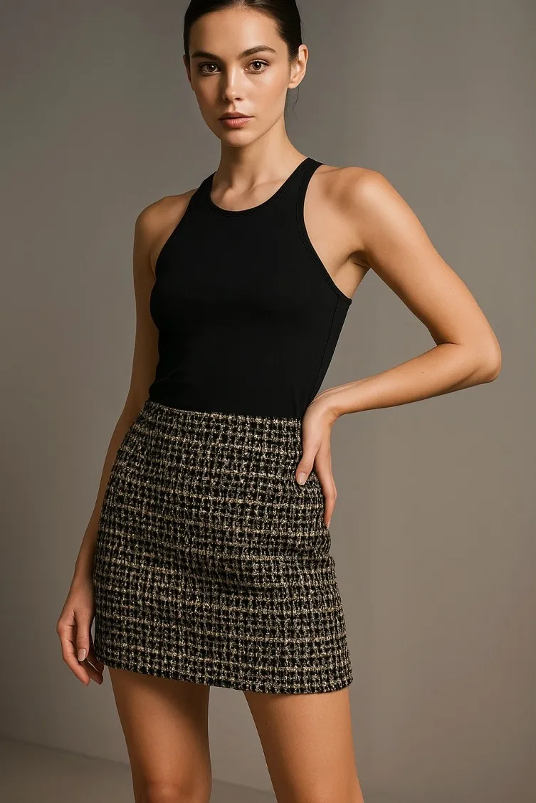 J.Crew Tweed Mini Skirt Black White Gold Textured Career Party Cute size 8 Gently used with no flaws. Chic tweed mini skirt ready to elevate your wardrobe. This skirt boasts a sophisticated black and white tweed pattern with subtle gold accents woven throughout, adding a touch of shimmer. It features a classic mini length and a flattering silhouette, making it ideal for both professional and social occasions. The skirt is fully lined for comfort and durability. A concealed back zipper ensures a smooth, seamless fit. Its timeless design and versatile color palette make it a wardrobe staple. Keywords: J.Crew, tweed skirt, mini skirt, black and white, gold accent, career skirt, party skirt, textured skirt, womens skirt, classic, retro, chic, wool skirt, winter skirt Measurements: Waist: 32" Hips: 42" Length: 14.5" Weight: 9 oz SKU:AB14