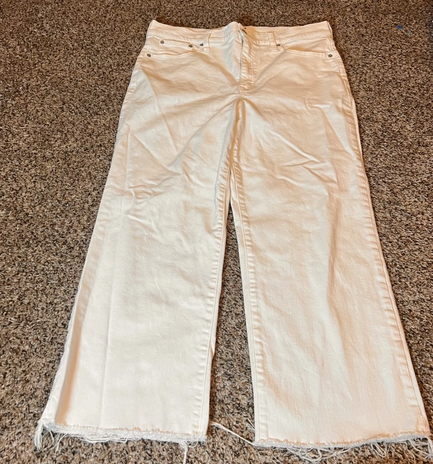 Keywords: J.Crew, wide leg jeans, crop jeans, white jeans, raw hem, denim pants, casual jeans, size 32, women's jeans, high waisted, cropped pants, fashion, style