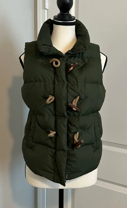 Keywords: J.Crew women's vest, toggle vest, quilted puffer vest, down feather vest, rope toggle closure, green vest, XS outerwear, layering vest, casual puffer, women's outdoor vest, sporty chic vest, hiking vest, cold weather vest, lightweight down vest, forest green vest, preppy, cabin core, coastal grandma, outdoorscore, rustic chic, classic American, sporty casual
