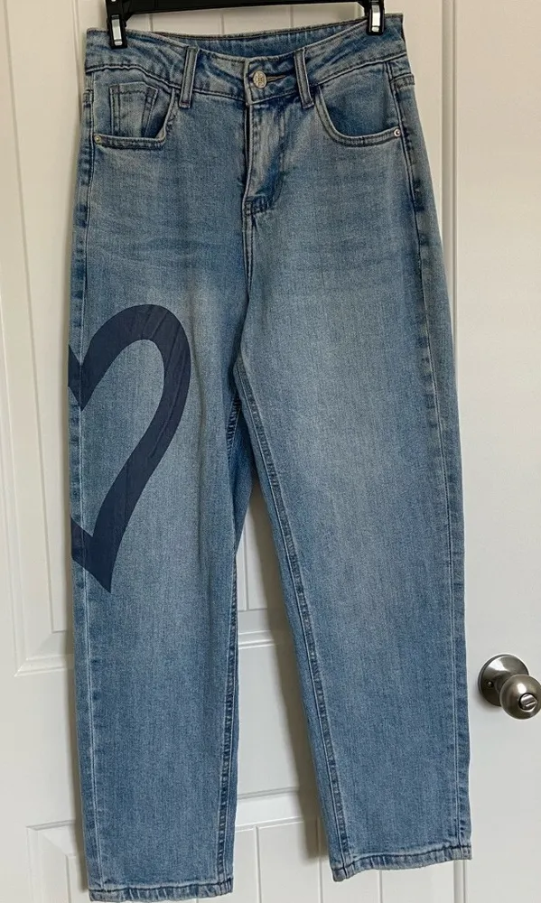 Women’s Jeans Pairs jeans. Jeans are light was with straight leg cut & high waist. Has heart decal o... Show more