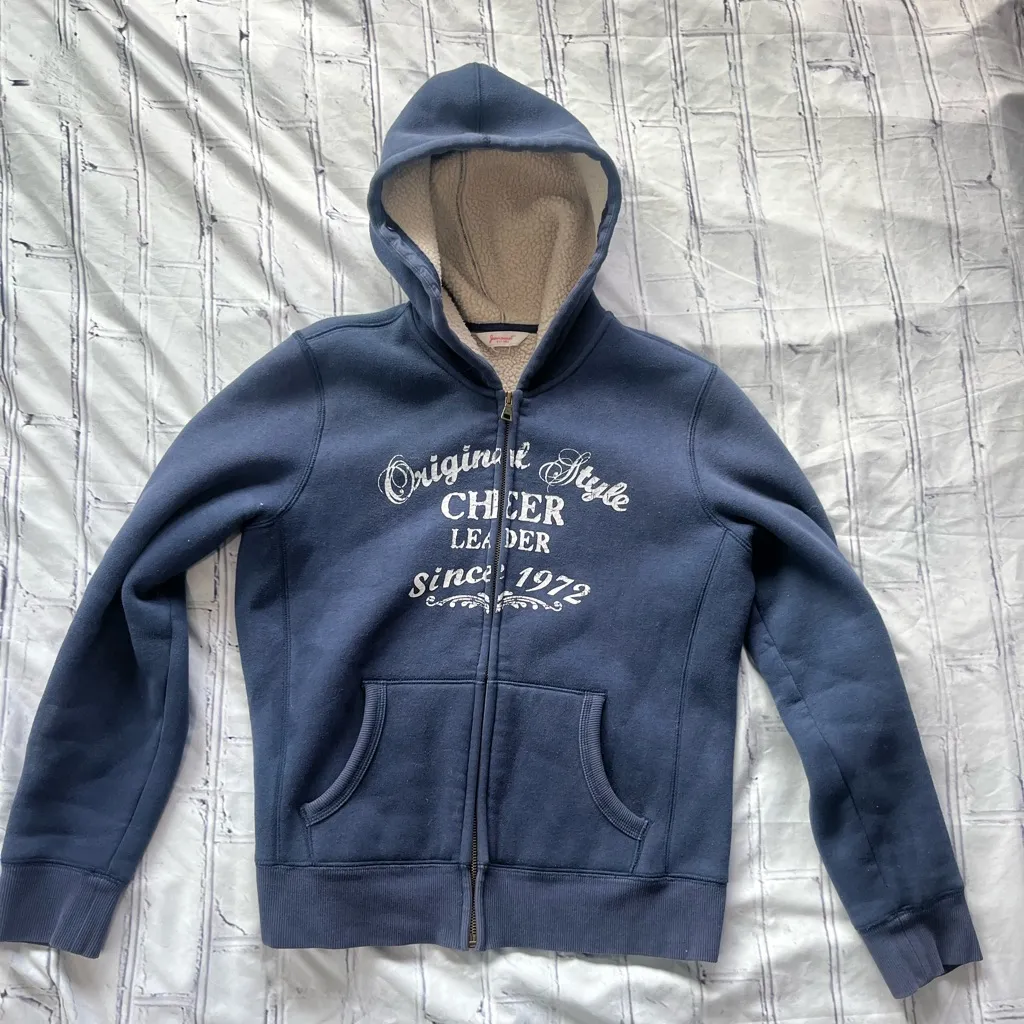 Cozy Jeanswest zip-front hoodie featuring a classic navy blue exterior with cream sherpa fleece lining throughout the body and hood. Designed with a full-zip closure, adjustable drawstring hood, and front kangaroo pockets. Front graphic reads “Original Style Cheer Leader Since 1972,” adding a vintage collegiate feel. Warm, structured, and ideal for casual layering in cooler weather. ⸻ Key Features: • Brand: Jeanswest • Size: Women’s Medium • Fit: Regular fit • Color/Wash: Navy blue with cream sherpa lining • Material: – Shell: Cotton / Polyester blend – Lining: Polyester sherpa (faux fleece) • Measurements: 20” Pit to Pit / 22” Shoulder to Hem • Features: Full zip front, sherpa-lined hood & body, graphic print, ribbed cuffs & hem, kangaroo pockets • Condition: Very good pre-owned condition (light general wear) ⸻ Style & Use: Perfect for casual everyday wear, lounging, outdoor errands, or layering on chilly days. The sherpa lining adds warmth without bulk, while the graphic gives it a relaxed, sporty-vintage vibe. Pairs well with jeans, leggings, or joggers. ⸻ Condition: Pre-owned item — please review all photos carefully and feel free to ask questions prior to purchase.